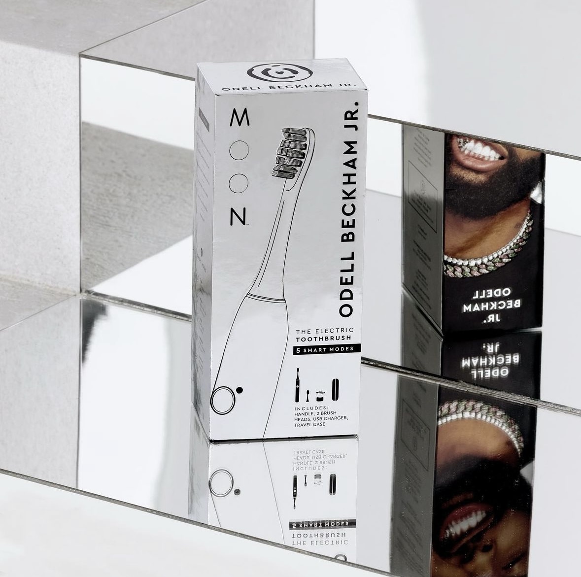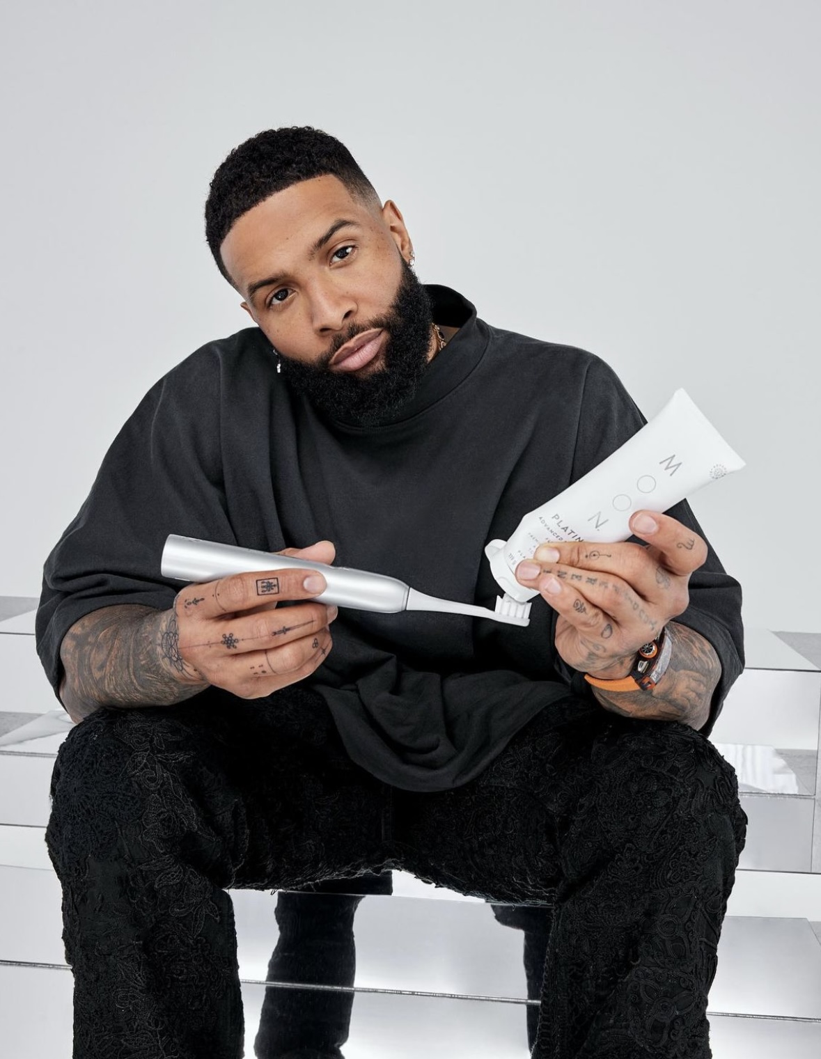 Wooden staircase covered in resin and concrete, with acrylic “mirror” decal. Faux sink fabricated from foam, resin, and concrete with OBJ logo embossed.